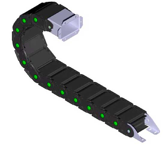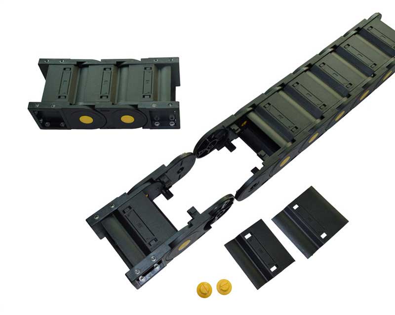 塑料拖鏈由兩個側鏈連接在一起,頂部和底部通過橋接件連接在一起。